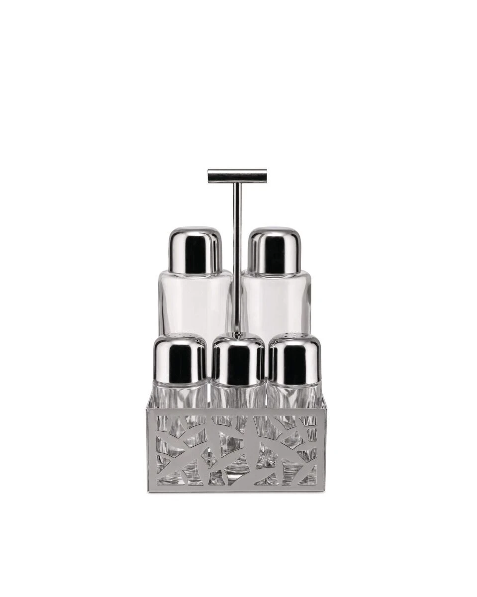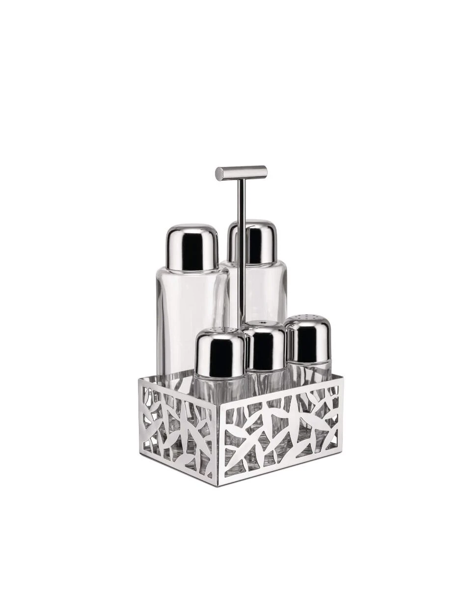 Het Alessi Cactus menagestel is een stijlvolle set met de vormen van een cactus op de roestvrijstalen houder. De set bevat een olie- en azijnfles met schenkdop en een zout, peper- en kruidenstrooier die samen in een onderstel zijn gevat. De set is ontworpen door ontwerper Marta Sasoni.