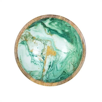 Op zoek naar een stijlvolle schaal om (zomerse) salades of andere gerechten te serveren? Dit exemplaar van By Room is er één voor op uw wensenlijst! Het item is vervaardigd uit mangohout en heeft een rond design met een diameter van 25 cm. De binnenkant is voorzien van een sticker met marble green print voor een speels effect. Combineer de schaal met het bijpassende slacouvert voor een elegant geheel.