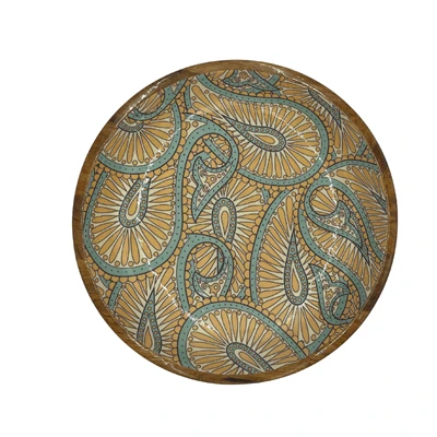 Op zoek naar een stijlvolle schaal om (zomerse) salades of andere gerechten te serveren? Dit exemplaar van By Room is er één voor op uw wensenlijst! Het item is vervaardigd uit mangohout en heeft een rond design met een diameter van 25 cm. De binnenkant is voorzien van een sticker met paisley print voor een speels effect. Combineer de schaal met het bijpassende slacouvert voor een elegant geheel.