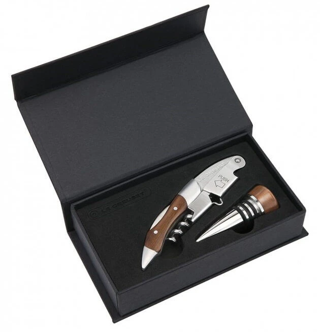 Het Le Creuset Screwpull kelnersmes heeft een roestvrijstalen lichaam en spiraal, en een houten handgreep. De opener is een kurkentrekker, flessenopener en capsulesnijder in één en heeft een lengte van 12 cm. Het kelnersmes wordt geleverd met een flesafsluiter om de wijn goed af te sluiten, met een houten bovenkant.Â