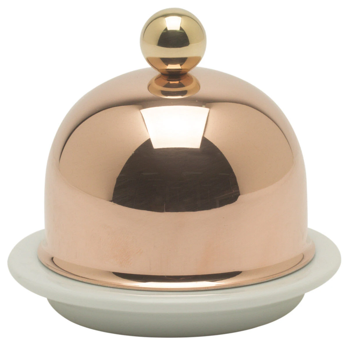 De porseleinen basis van de Mauviel botervloot is vaatwasmachinebestendig. De koperen cloche kunt u reinigen met warm water en afwasmiddel. Om de glans van het koper te behouden poetst u het met Copperbrill koperpoets.