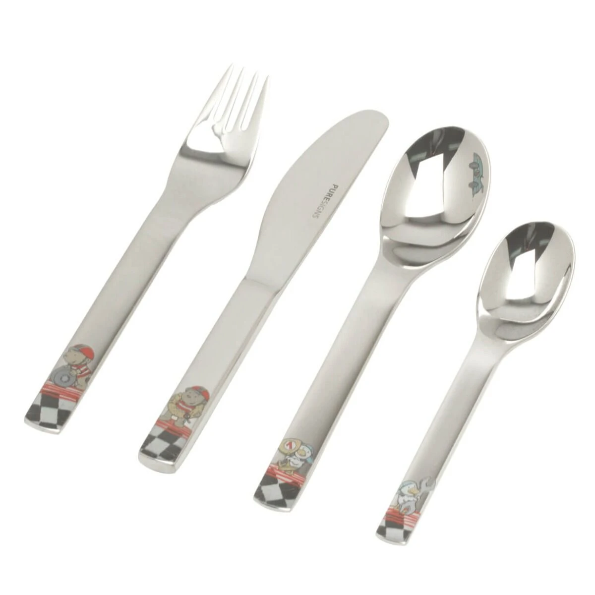 Het Puresigns One Quick kinderbestek is vervaardigd uit glanzend roestvrij staal. Dit bestek is de kinderversie van het Puresigns One bestek en is voorzien van een race-print.