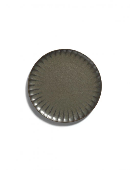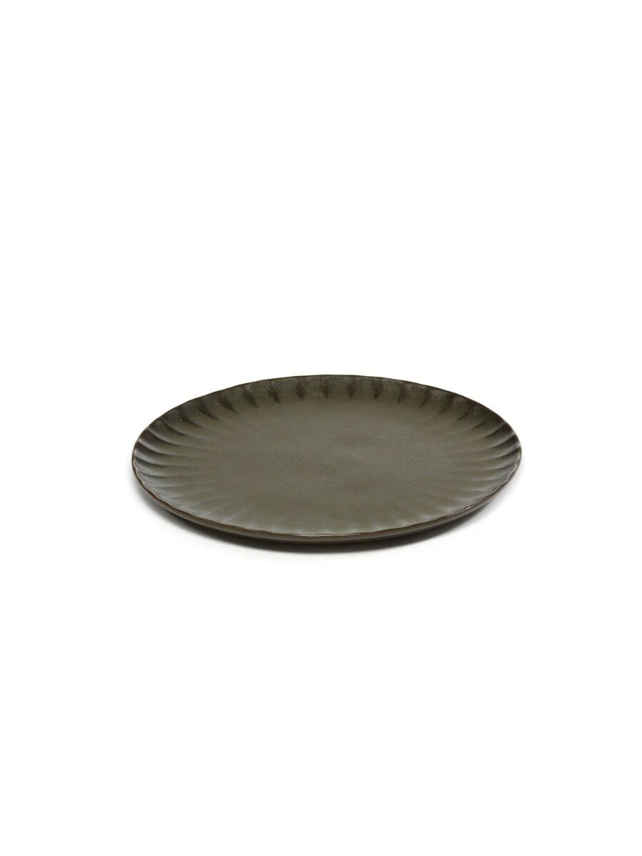 Het bord M van Serax INKU heeft een diameter van 21 cm en is 1,7 cm hoog, en is aan de rand voorzien van een decoratief ribbelpatroon. Het bord is gemaakt van steengoed en is groen geglazuurd. Gebruik voor het serveren van (kleine) gerechten.