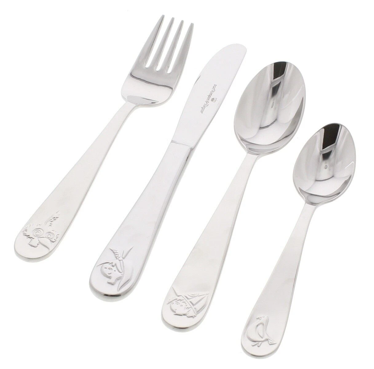 Met het Van Kempen & Begeer Junior kinderbestek eten ook de jongste eters met plezier mee. De bestekdelen zijn voorzien van vrolijke afbeeldingen. Het bestek is vervaardigd uit hoogwaardig roestvrij staal dat goed bestand is tegen voedselzuren. Het formaat van onderdelen van het bestek zijn goed afgestemd op de kinderhand en -mond. Het mes heeft een afgeronde bovenzijde waarmee niet ‘gestoken’ kan worden. Tevens is het mes botter waardoor het veiliger is in gebruik door kinderen.